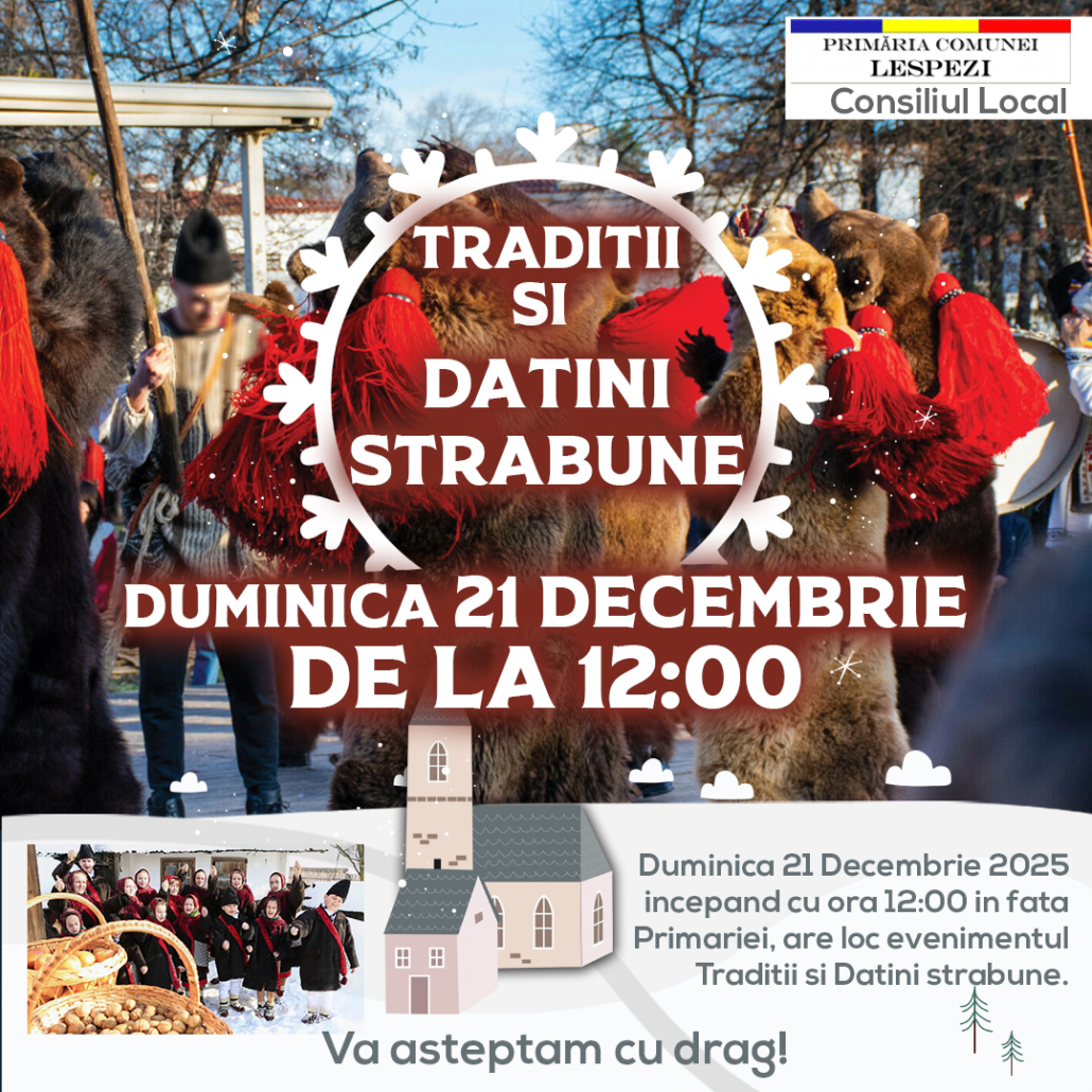 Primฤria ศi Consiliul Local Lespezi au plฤcerea de a invita รฎntreaga comunitate la un eveniment cultural de excepศie, dedicat conservฤrii ศi promovฤrii autenticului romรขnesc.