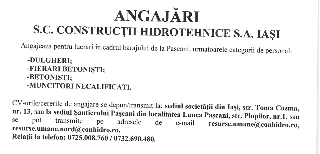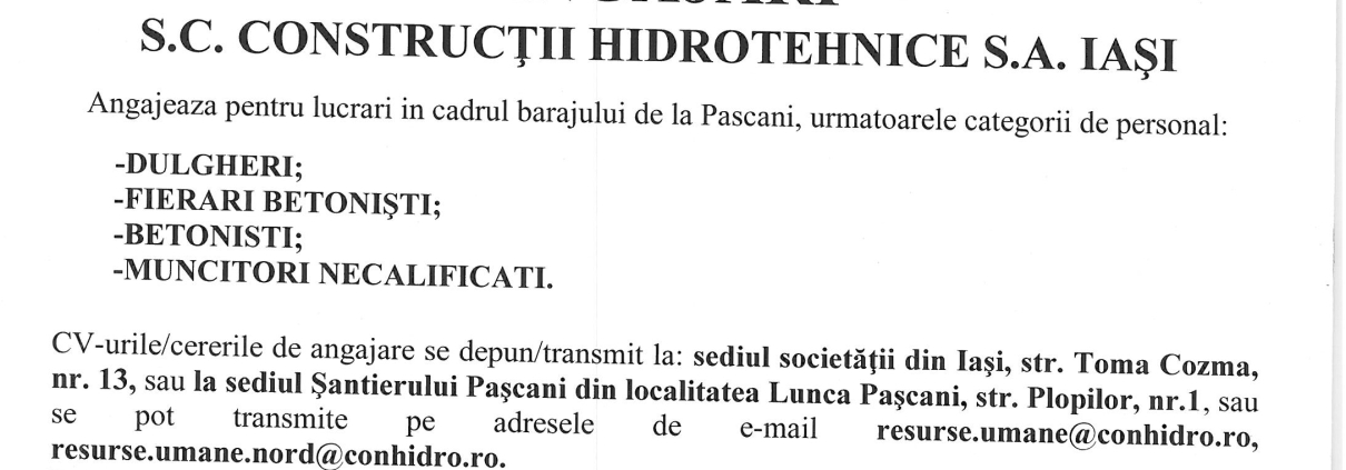 Angajeaza pentru lucrari in cadrul barajului de la Pascani, urmatoarele categorii de personal: