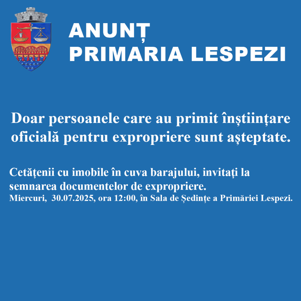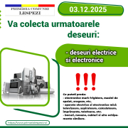 Primăria Comunei Lespezi, județul Iași, informează cetățenii că în data de 3 decembrie incepand cu orele 9:00 va avea loc o campanie de colectare a deșeurilor electrice și electronice (DEEE) provenite din gospodării.