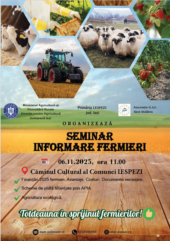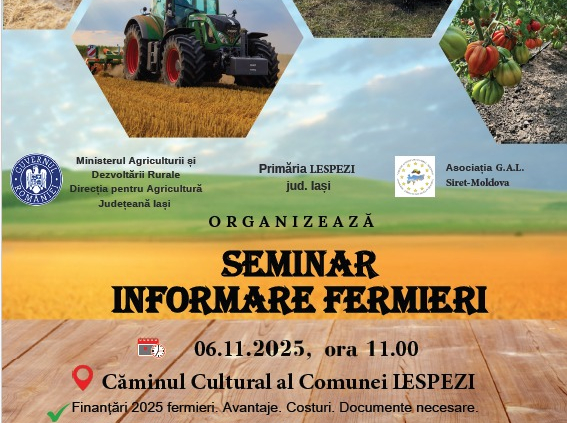 Direcția pentru Agricultură Județeană (DAJ) Iași, în parteneriat cu Primăria Lespezi și Asociația G.A.L. Siret-Moldova, invită toți fermierii din regiune la un seminar informativ vital. Evenimentul este dedicat exclusiv agricultorilor din comunele Lespezi, Sirețel, Vânători, Tătăruși și Valea Seacă.