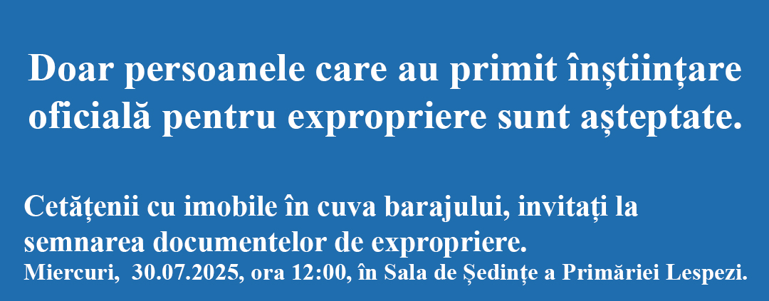 Miercuri, 30.07.2025, ora 12:00, รฎn Sala de ศedinศe a Primฤriei Lespezi, va avea loc semnarea documentelor de expropriere pentru proiectul hidroenergetic.